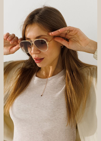 100% защ.УФ, категорія 2:. Оправа-золотий, лінза-світло-коричневий з прозорим (на фото колір лінзи може відрізнятися від реального на 1-2 тони через різницю в налаштуваннях монітора). Метричні характеристики: ширина лінзи – 60 мм; ширина перенісся - 17 мм; довжина дужки – 145 мм. У комплекті футляр, мішечок.
