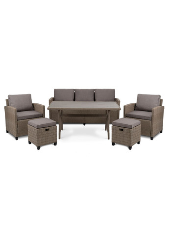 Комплект садових меблів Di Volio Genova Бажаєте відчути непередавану атмосферу затишного італійського міста, повністю занурившись у його чарівний антураж? Тоді розкішний комплект садових меблів Di Volio Genova з ротанга - саме те, що вам потрібно. Елегантний набір стане вашим вірним супутником у цій захопливій подорожі у країну веселощів, доброзичливості та дружби. Шляхетні кольори, міцні матеріали, вишуканий дизайн, філігранність виконання кожної деталі, м'які сидіння, приємні на дотик поверхні - ви просто не зможете встояти перед таким феєричним поєднанням практичності й естетики, адже він із перших хвилин назавжди підкорить ваше серце. Купити садові меблі Di Volio Genova з ротанга - означає стати власником не тільки приголомшливо витонченого, але й неймовірно надійного набору, адже він - продукт італійської марки Di Volio, яка на цілий світ відома високою якістю своїх матеріалів та дивовижною естетичністю готових товарів. Плануючи замовити садові меблі з ротанга від Di Volio, будьте впевнені у своїй потенційній покупці, оскільки виробник забезпечує її потрібною сертифікацією та гарантією обслуговування на 24 місяці. У комплект садових меблів Di Volio Genova входить великий тримісний диван, два зручні крісла, два невеликі пуфи, широкий стіл, 7 подушок для сидіння, 5 подушок для спинок та набір кріпильних елементів для самостійного збирання. Якісні матеріали Основна конструкція виготовлена з добротного алюмінію, який чудово протистоїть передчасній корозії та ранньому зношуванню, добре переносить різку зміну температур, надмірну вологу, агресивний ультрафіолет та інші погодні умови. Зовнішня оббивка, зроблена з міцного техноротанга, неймовірно стійка до забруднень і будь-яких інших зовнішніх факторів, а також надзвичайно надійна та довговічна у використанні. Ергономічність деталей Стильний столик не тільки розмістить на собі всі напої і закуски, необхідні для класного вечора, але й об'єднає ваших рідних і близьких, адже за ним одночасно може розміститися декілька людей. Простора стільниця, виготовлена з якісного полімерного матеріалу, чудово справляється з вологою та забрудненнями, прекрасно протистоїть перепадам температур і дуже проста в догляді. Надійність аксесуарів У набір садових меблів Di Volio Genova входить комплект найм'якіших подушок для сидінь і спинок зі спеціальними захисними чохлами. Чохли виготовлені з міцної тканини, просоченої особливим розчином, який має відмінний рівень водо- та брудостійкості. Завдяки цьому вони неймовірно зручні в очищенні та надзвичайно практичні у використанні.Також в чохли вшита прихована застібка-блискавка, яка значно спрощує процес їхнього зняття для подальшого капітального прання. Вміст комплекту: 1 великий стіл 2 крісла 2 пуфи 1 тримісний диван 7 подушок для сидінь 5 подушок для спинок монтажний комплект Характеристики: Бренд: Di Volio Модель: Genova DV-012GF Колір ротанга: бежевий Колір подушки: світло-сірий Розміри столу: довжина 144,5см / ширина 74см / висота 67,5см Ручна робота з ПЕ пластику, ротанга Сталевий каркас Стільниця з пластику, що імітує дерево Розміри крісел: ширина 73см / глибина 68см / глибина сидіння 57,5см / висота 73см Розміри дивана: довжина 171,5см / глибина 68см / висота 74см Розміри пуфів: довжина 41см / ширина 41см / висота 39см Наволочки виготовлені з просоченого матеріалу, на блискавці Довговічні і прості в догляді 
