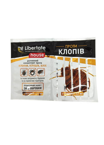 Концентрат Libertate від клопів кліщів і бліх 2 обробки Libertate концентрат — ефективний професійний інсектицид для знищення постільних клопів, кліщів, бліх та інших шкідників. Один флакон розрахований на дві повноцінні обробки, що робить засіб вигідним і зручним у використанні. Засіб має контактно-шлункову дію, швидко вражає нервову систему комах, викликає параліч і загибель. Ефективний проти стійких до інших препаратів популяцій. Забезпечує залишковий ефект до 21 дня, перешкоджаючи повторному зараженню. Без різкого запаху, не залишає плям. Підходить для обробки матраців, ліжок, меблів, плінтусів, щілин, санвузлів та підсобних приміщень. Після розведення у воді наноситься за допомогою розпилювача. Застосування – розвести концентрат відповідно до інструкції (1 флакон на 0,5–1 л води), обробити уражені поверхні, провітрити приміщення після висихання. Використовувати засоби індивідуального захисту.