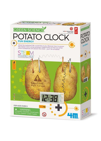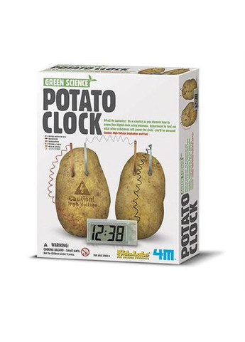 Час фантастичних експериментів! Зберіть цифровий годинник, що працює від двох картоплин. Ви дізнаєтеся, як з'являється електрика з картоплі, і які дивовижні хімічні реакції при цьому відбуваються. Шляхом дослідів із набором для досліджень від 4М ви знайдете інші плоди і речовини, які можуть живити годинник.Як працює картопляна батарейка? У цьому випадку коренеплід виступає в якості електроліту. Він вступає в хімічну реакцію з металом мідної та цинкової пластин, які називаються електродами. Енергія хімічної реакції металу перетворюється на електричну. Струм тече по дротах між цинковою та мідною пластинами і запускає годинник.Спробуйте замінити картоплю на помідор або фрукти: лимон, апельсин, грушу. Запустіть годинник, використовуючи різні рідини: солону воду, соки, чай. Перевірте, які фрукти, овочі й рідини створюють електричну енергію для годинника, а які – ні. Овочева батарея працює так само, як батареї, які використовуються в ліхтариках, радіоприймачах і плеєрах. Ці батареї містять різні хімічні речовини, які виробляють електрику.Набір від 4М буде цікавий дітям молодшого шкільного віку. Створюючи картопляний годинник, діти дізнаються нові факти з хімії та фізики, підвищать інтелект, інтерес до науки, розвинуть мислення, винахідливість.Цей набір від 4М із серії Green Science виграв чотири нагороди в 2012-2016 роках у Китаї, Німеччині та Італії. Його відзначили за інноваційний дизайн і креативність. Набір підходить для навчання за реджио-методикою.У наборі:Цифровий годинник із дротами – 1 шт.Колба – 1 шт.Мідні пластинки – 2 шт.Цинкові пластинки – 2 шт.Скотч – 1 шт.З’єднувальний дріт – 1 шт.Інструкція – 1 шт.