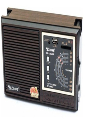Радіоприймач Golon RX-9100 відтворює чудовий звук і добре приймає сигнал. Працює від вбудованого акумулятора (6V) або чотирьох батарейок R20, або від мережі 220V (мережевий кабель в комплекті). Від кабелю живлення заряджається і акумулятор (для збереження працездатності акумулятора слід відключити від мережі, якщо акумулятор повністю заряджений) Характеристики Тип: радіо; Частотний діапазон: FM 88-108 МГц, SW 3,40-23.0 МГц, AM 530-1600 КГц; Заряд акумулятора від мережі: 220V/50Hz; Живлення: батарея (4хАА), акумулятор; Вбудований LED ліхтарик; Відтворення аудіо файлів у форматі MP3 з картки пам'яті SD та флешки; режим перемикання треків за допомогою кнопок на панелі; Механічний перемикач частот; Механічний пошук радіохвиль; Вбудований акумулятор; Механічна регулювання гучності; Довжина: 12 см; Ширина: 8.5 см; Висота: 16 см; Комплектація: Радіоприймач; Кабель підключення до електромережі.