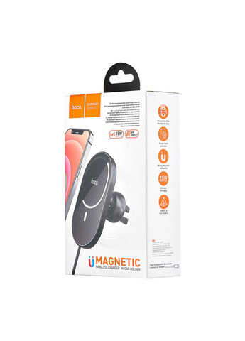 Автомобільний тримач Hoco CA90 Magnetic Car Wireless Charger забезпечує надійну фіксацію вашого смартфона та можливість заряджати сумісні з технологією QI пристрої. Він монтується на вентиляційну решітку автомобіля за допомогою силіконової ніжки-прищіпки. Телефон кріпиться за допомогою магнітів MagSafe, які розташовані всередині пристроїв серії iPhone 12 або всередині сумісних чохлів з технологією MagSafe. За підтримки стандарту MagSafe, потужність заряджання досягає 15 Вт. Тримач для смартфонів Hoco CA90 Magnetic Car Wireless Charger має компактний та надійний дизайн із якісного пластику й алюмінієвого сплаву. Головка моделі обладнана шарнірним з'єднанням, що дозволяє змінювати положення комунікатора під будь-яким кутом для зручного розміщення екрана телефона. Пристрій отримує живлення від автомобільного зарядного пристрою з роз'ємом USB-C та потужністю не менше 15 Вт. Особливості включають преміальний дизайн, функцію бездротового заряджання QI, магнітне кріплення, підтримку MagSafe і заряджання до 15 Вт, зручне встановлення в дефлектор та обертову конструкцію на 360 градусів. Характеристики: Тип: Автотримач з функцією бездротової зарядки Призначення:Для мобільних телефонів Місце установки:Дефлектор Тип кріплення:Затискач Країна-виробник:Китай Матеріал корпусу:Пластик Вага: 110 г Колір: Чорний і сірий