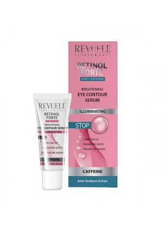 Сироватка від набряків, темних кіл і пігментації під очима Revuele Retinol Forte Сироватка для контуру очей з ретинолом Forte - це легка формула, спеціально розроблена для зменшення появи недосконалостей на шкірі навколо очей. Ретинол, екстракт гороху NaturePep та кофеїн допомагають усунути темні кола під очима, зменшуючи вироблення меланіну та покращуючи мікроциркуляцію шкіри. Контурна сироватка покращує, вирівнює та розгладжує шкіру повік, уповільнює процеси старіння, зменшує пігментні плями та мінімізує набряклість. Серум для шкіри навколо очей активізує вироблення колагену та стимулює процес оновлення клітин. Колаген також запобігає передчасному старінню шкіри навколо очей та розгладжує тонкі лінії та зморшки. За допомогою аплікатора сироватка наноситься безпосередньо на пігментовані ділянки шкіри навколо очей. Спосіб застосування: Нанесіть невелику кількість сироватки на очищену суху шкіру навколо очей. Невеликими рухами, що поплескують, до повного вбирання. Ефект помітний після першого застосування. Для досягнення найкращих результатів використовуйте разом з усіма професійними засобами даної лінійки. Об'єм: 25 мл
