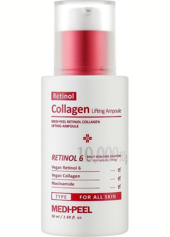 Retinol Collagen Lifting Ampoule від Medi-Peel - це ліфтинг-сироватка, що містить високу концентрацію ретинолу і колагену, призначену для боротьби зі зморшками і забезпечення пружності шкіри. Ретинол, який є формою вітаміну А, допомагає стимулювати вироблення колагену і прискорює оновлення клітин шкіри, що зі свого боку робить шкіру більш пружною і покращує її текстуру.