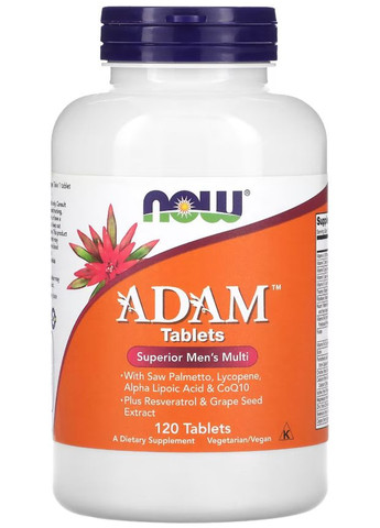 Мультивітаміни для чоловіків NOW ADAM 120 таб Мультивітаміни для чоловіків NOW ADAM 120 таб ADAM від NOW Foods - це комплексний мультивітамінний комплекс для чоловіків, що містить широкий спектр вітамінів, мінералів, антиоксидантів та рослинних екстрактів, розроблений для підтримки здоров'я, енергії та чоловічої активності. Корисні властивості: Містить вітаміни A, C, D, E, групи B – для підтримки енергії та обміну речовин. Магній, цинк та селен – для підтримки імунітету та здоров'я простати. Коензим Q10 та альфа-ліпоєва кислота - Потужні антиоксиданти для захисту клітин. Лікопін та лютеїн – для здоров'я серця, очей та шкіри. Екстракти пальми сереноа та женьшеню – для підтримки чоловічого здоров'я та гормонального балансу. Без штучних барвників та консервантів – чиста та натуральна формула. Склад в одній порції (1 таблетка): Вітамін A (100% у вигляді бета-каротину) – 5000 МО Вітамін С (з аскорбату кальцію) – 125 мг Вітамін D (у вигляді ергокальциферолу) – 500 МО Вітамін E (у вигляді d-альфа токоферил сукцинату) – 75 МО Вітамін K (у вигляді менахінону K2 та фітонадіону K1) - 40 мкг Тіамін (вітамін B1) (з тіаміну гідрохлориду) – 12,5 мг Рибофлавін (вітамін B2) - 12,5 мг Ніацин (вітамін B3) (у вигляді нікотинаміду та з інозитолу гексанікотинату) - 17,5 мг Вітамін B6 (з піридоксину гідрохлориду та піридоксаль-5-фосфату [P-5-P]) - 12,5 мг Фолат (у вигляді фолієвої кислоти) – 200 мкг Вітамін B12 (у вигляді метилкобаламіну) - 125 мкг Біотин – 150 мкг Пантотенова кислота (вітамін B5) (з пантотенату кальцію) – 25 мг Кальцій (з аскорбату кальцію та цитрату кальцію) – 25 мг Йод (з йодиду калію) – 75 мкг Магній (з цитрату магнію) – 12,5 мг Цинк (з бісгліцинату цинку) (TRAACS) – 15 мг Селен (з L-селенометіоніну) – 100 мкг Мідь (з бісгліцинату міді TRAACS) – 0,25 мг Марганець (з бігліцинату магнію) (TRAACS) – 1 мг Хром (з піколінату хрому) - 100 мкг Молібден (з молібдату натрію) – 37,5 мкг Калій (з хлориду калію) – 12,5 мг Ягоди сереної (Serenoa repens) – 80 мг Альфа-ліпоєва кислота - 25 мг Концентрат з органічного алое віра (листя) – 25 мг. Екстракт виноградних кісточок (Vitis vinifera) (стандартизований для поліфенолів) – 12,5 мг Холін (з бітартрату холіну) - 12,5 мг Інозитол – 12,5 мг CoQ10 (коензим Q10) – 7,5 мг Натуральний трансресвератрол (з екстракту кореня рейнутрії японської [Polygonum cuspidatum]) – 5 мг Лікопін з натурального екстракту томатів (Solanum lycopersicum) – 1,5 мг Лютеїн (з екстракту квіток чорнобривців [Tagetes erecta]) (FloraGLO) - 250 мкг Інгредієнти: Мікрокристалічна целюлоза, стеаринова кислота (рослинного походження), кроскармелоза натрію, діоксид кремнію та оболонка з рослинної сировини. Вітамін E із сої без ГМО. Рекомендації щодо застосування Приймайте по одній таблетці щодня під час їжі.