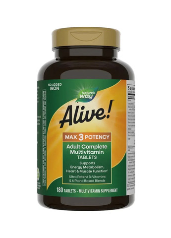 Мультивітаміни без заліза Alive! Max3 Potency Nature's Way 180 таблеток — це потужний мультивітамінний комплекс для чоловіків і жінок, яким не потрібен додатковий прийом заліза. Формула поєднує 26 вітамінів і мінералів, натуральні рослинні екстракти, ферменти, антиоксиданти й омега-кислоти, щоб підтримувати життєві сили, стійкість до навантажень, роботу серця, мозку, травлення та імунної системи. Комплекс розроблено для тих, хто живе у швидкому ритмі, зазнає інтелектуальних або фізичних навантажень, займається спортом або просто хоче залишатися енергійним і активним без ризику надлишку заліза. Вітаміни групи B (B1, B2, B3, B5, B6, B12, фолат, біотин) — важливі для нервової системи, беруть участь у виробленні енергії та підтримують настрій. B12 і фолат покращують кровотворення, а пантотенова кислота підтримує роботу надниркових залоз, допомагаючи організму справлятися зі стресом. Вітаміни C і E — антиоксиданти, які захищають клітини від окисного стресу, беруть участь у формуванні колагену і зміцнюють імунітет. Вітамін C також покращує засвоєння інших нутрієнтів, зокрема цинку і селену. Вітамін D3 і кальцій — для здоров'я кісток, зубів і м'язів. У комплексі використовується холекальциферол (натуральна форма D3), який допомагає кальцію засвоюватися і сприяє підтримці щільності кісткової тканини. Вітамін K відіграє важливу роль у метаболізмі кісток і регулює згортання крові. Цинк, селен, магній, йод, мідь, марганець, молібден — мікроелементи, що беруть участь у десятках процесів: від синтезу гормонів до антиоксидантного захисту, регуляції обміну речовин і підтримки імунної системи. Холін та інозитол важливі для роботи мозку і печінки. Вони беруть участь у передачі нервових імпульсів, обміні жирів і захисті клітинних мембран. Органічні суміші Daily Greens™, Orchard Fruits™ і Garden Veggies™ збагачують раціон флавоноїдами, каротиноїдами та фітонутрієнтами з овочів і фруктів. Вони посилюють загальний тонус, борються з окислювальним стресом і позитивно впливають на травлення. Суміш грибів (рейші, шиітаке, чага, майтаке та ін.) — джерело бета-глюканів та інших активних сполук, що підтримують імунітет, витривалість і адаптацію організму. Ферменти (папаїн, бромелаїн, бетаїн HCl) допомагають краще перетравлювати їжу і засвоювати корисні речовини, зменшуючи навантаження на ШКТ. Омега-3-6-9 жирні кислоти з насіння льону та соняшнику покращують стан шкіри, підтримують серце і гормональний баланс. Рослинні компоненти для підтримки серця (глід, коензим Q10, екстракт рейнутрії японської) сприяють нормальній роботі серцево-судинної системи, підтримують рівень енергії та покращують кровообіг. Женьшень — натуральний адаптоген, який допомагає в разі перевтоми, підтримує працездатність і стійкість до стресу. Добавка підійде тим, хто шукає потужний мультивітамінний комплекс без заліза — особливо чоловікам, літнім людям, а також тим, хто не має потреби в додатковому прийомі заліза або має протипоказання. Підходить у разі підвищених розумових і фізичних навантажень, зниження енергії, ослаблення імунітету або нерівномірного харчування. Переваги добавки: Максимально повна мультивітамінна формула без заліза. Підтримка енергії, імунітету, мозку, серця та травлення. Натуральні екстракти овочів, фруктів, грибів і зелені. Омега-кислоти, коензим Q10, антиоксиданти та ферменти. Підходить для тривал