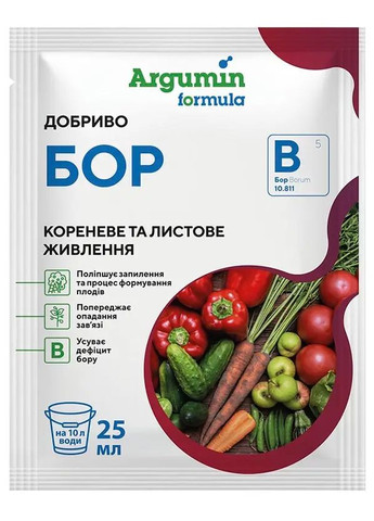 Добриво Argumin formula Бор — це концентроване рідке добриво, збагачене бором, для кореневого та листового живлення. Воно створене для усунення дефіциту бору в овочевих, плодових та ягідних культурах. Завдяки амінокислотам у складі засіб сприяє кращому засвоєнню бору, посилює обмінні процеси в рослинах і підвищує їхню стійкість до стресів, що особливо важливо в період активного генеративного розвитку. Основні переваги: - Швидко усуває дефіцит бору, необхідного для нормального розвитку рослин. - Сприяє покращенню запилення і зав’язування плодів. - Запобігає опаданню зав’язі, забезпечуючи стабільний урожай. Рекомендації щодо застосування: 1. Приготування розчину: o Розчиніть 25 мл препарату у 10 літрах води. 2. Методи внесення: o Поливати рослини під корінь. o Обприскувати листя в період вегетації. 3. Час внесення: o Найбільш ефективно застосовувати перед цвітінням і на стадії формування плодів. o Використовувати 2-3 рази за сезон. Сумісність: Добриво поєднується з більшістю інших агрохімікатів і добрив. Перед приготуванням суміші рекомендується провести тест на сумісність. Ознаки дефіциту бору: - Недостатність бору проявляється у вигляді: - Пригнічення росту коренів і стебел. - Хлорозу верхівкової точки росту, який може призвести до її відмирання. - Відсутності квітів або їх тривалого цвітіння без утворення зав’язі. - Передчасного опадання плодів.