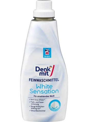 Засіб для прання Denkmit для білих речей White Sensation 1л (40 прань) Рідкий порошок для стирання білого білизни. Концентрат. Відмінно відмиває білизну навіть за 20С. Нежна формула догляду, що зберігає при кожному пранні білизну вашого одягу, так що ваш одяг виглядає новим набагато довше. Також підходить для шовку. Рідкий пральний порошок Denkmit захищає волокна тканини від пошкоджень під час прання, використовується для прання білого білизни, захищає деталі стиральної машини від накипу. Підходити як для ручної, так і для машинної прання. Спосіб застосування: зверніть увагу на рекомендації з прання та догляду на етикетці одягу. Прання у пральній машині (на 2,5 кг сухого білизни): 1 ковпачок = приблизно 38 мл. Ручне прання: 25 мл = 2/3 колпачка на 10 л (теплої) води.