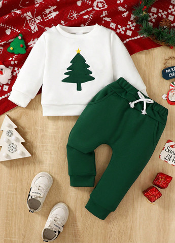 Різдвяний комплект зі світшота та штанів для хлопчиків. Він доступний у біло-зеленому кольорі. Тканина має невелику еластичність.