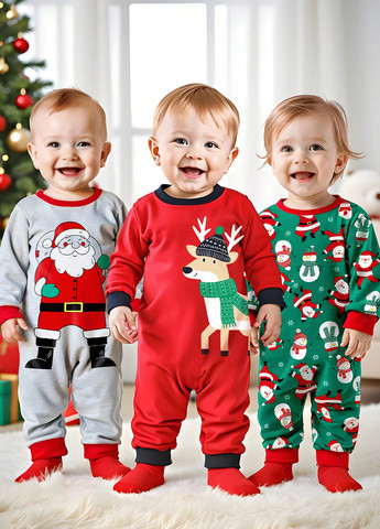 Цей комплект дитячих комбінезонів із трьох штук прикрашений святковими різдвяними принтами Санти, сніговика та оленя. Він призначений для хлопчиків та дівчаток. Комбінезон включає наряд з довгими рукавами, круглим вирізом і високою талією. Тканина трохи тягнеться для комфорту. Контрастні деталі з окантовкою покращують дизайн. Ідеально підходить для різдвяних фотосесій та сімейних посиденьок.