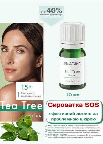 Унікальна сироватка Dr. C. Tuna Tea Tree SOS Serum стане незамінною помічницею догляду за шкірою, схильною до запалень і вугрової висипки. Завдяки активній лікувальній формулі, що складається з чистого рослинного екстракту чайного дерева, сироватка абсолютно безпечна для всіх типів шкіри, ідеально підходить для чутливої. Діюча речовина проникає глибоко в шкіру, регулюючи секрецію шкірного сала, усуваючи жирний блиск, що запобігає всіма видами акне та подразнення, заспокоюючи шкіру. Невелику кількість сироватки нанести локально, на очищену суху шкіру (достатньо 2-3 краплі) один раз на день. Рекомендується використовувати короткими курсами (близько 10-15 днів). За цей час досягається максимальний ефект. Повторювати курси можна 3-4 рази на рік. Основні компоненти: Tea Tree Oil: має потужну антибактеріальну, протигрибкову та противірусну дію, здатну вбивати бактерії, що провокують розвиток акне. Rosemary Extract: потужний антиоксидант, екстракт листя розмарину захищає шкіру та зменшує прояви акне. Thyme Extract: збалансує та заспокоює схильну акне шкіру завдяки антиоксидантним властивостям. Незамінна річ для домашньої аптечки! - Вискочив прищ? Ця сироватка допоможе швиденько його прибрати! - має протизапальні властивості і тому допоможе швидко позбутися запалення. - допомагає зняти свербіж при укусах комарів - має протигрибкову дію і допоможе боротися з деякими видами грибка. - допоможе позбутися герпесу Спосіб застосування: 1-2 крапельки сироватки Нанеси сироватки на проблемну зону за допомогою ватної палички. ПОВНИЙ СПИСОК ІНГРЕДІЄНТІВ: Water/Aqua, Alcohol Denat., Polysorbate-20, Tea Tree Oil/Melaleuca Alternifolia Leaf Oil, Thymus Vulgaris Leaf Extract, Rosmarinus Officinalis Leaf Extract, Citric Acid, Sodium Oil.