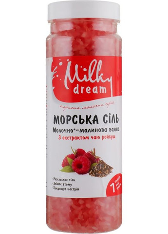 Ванна з морською сіллю, теплим ароматом малини та молока — ідеальний спосіб позбавитися втоми, повернути відчуття спокою й внутрішньої гармонії, а також подбати про красу та здоров’я шкіри тіла. Формула засобу багата мінералами, вітамінами, протеїнами молока, екстрактами чаю ройбуш і ягід малини — прекрасна основа для б’юті-релаксу з ефектом SPA. Насолоджуйтеся приємним купанням, дією теплої води й ефектом, який подарує б’юті-процедура — м’якістю та гладкістю шовковистої й пружної шкіри.Особливості морської солі для ванн «Молочно-малинова ванна» від бренда Milky Dream:- основа — натуральна морська сіль; - до складу входять молочні протеїни, екстракт ройбуша; - насичує шкіру вітамінами; - забезпечує інтенсивну антиоксидантну дію; - зміцнює шкірний покрив і надає пружність; - глибоко живить і зволожує шкірний покрив; - поліпшує колір шкіри; - пом’якшує та додає шовковистість; - аромат стиглої малини покращує настрій.