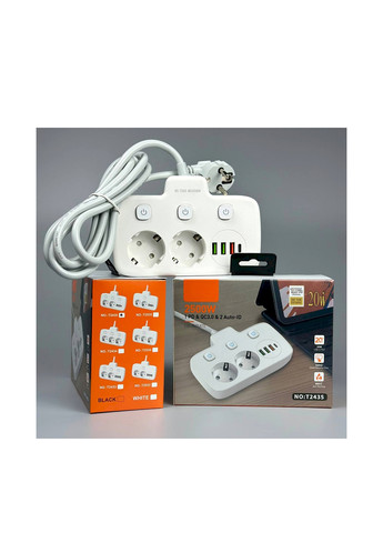 Подовжувач мережі Power Socket No.T2435 (2 м, 2 розетки, 3 USB + Type-C, 2500W). Практичний та сучасний мережевий подовжувач Power Socket No.T2435 стане чудовим рішенням для дому чи офісу. Він поєднує стандартні розетки та порти для заряджання гаджетів, дозволяючи підключати побутову техніку та одночасно заряджати смартфони, планшети або інші пристрої без зайвих перехідників. Завдяки потужності до 2500W подовжувач витримує навантаження від більшості електроприладів, а кабель довжиною 2 метри забезпечує зручність розташування в будь-якій кімнаті. Пристрій оснащений 3 USB-портами та роз'ємом Type-C, що робить його універсальним помічником для сучасних користувачів. Характеристики: Кількість розеток: 2. Порти: 3 USB+Type-C. Потужність: до 2500W. Довжина кабелю: 2 м. Гарантія: 3 місяці для перевірки. Ідеальний варіант для дому, офісу або подорожей – компактний, безпечний та багатофункціональний!
