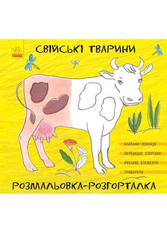 Це не просто розмальовка зі свійськими тваринами, це розмальовка гра, у якій малюк знайде несподівані перевтілення та цікаві пригоди. На одному розвороті дитина побачить щось на зразок мультика: ось мама- качка з каченятами пливе по ставку, а відкриваєш клапани і птахи один за одним пірнають у воду. Варто лише відгорнути віконце і собака розірве - газету, порося бовтнеться в калюжу, а козенята припинять буцатися. «По-дитячому» розфарбовані малюнки нададуть упевненості малюкові: він не боятиметься вилізти за контур або дібрати неправильний колір. Після того, як ви розфарбуєте всю книжку, ви можете ще довго гратися з нею й роздивлятися кумедні малюнки.