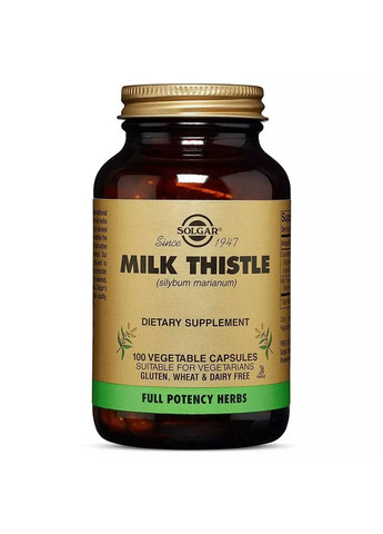 Ця безпечна рослина як раніше, так і зараз широко застосовується у комплексній терапії різних захворювань печінки, раку та діабету Розмір порції: 1 капсула швидкого вивільнення Кількість порцій: 100 Кількість на порцію % від добової потреби Розторопша плямиста (Silybum marianum) (насіння) (250 мг екстракту 4:1) 1000 мг (1 г) † † Добову потребу не визначено.