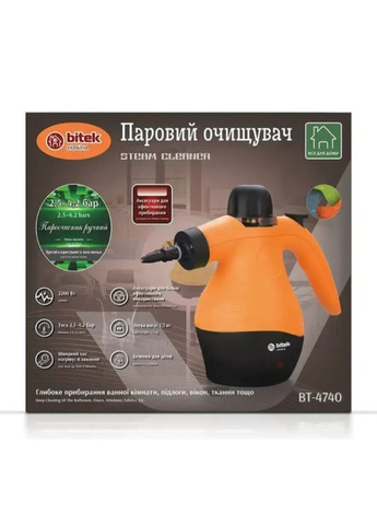 Електричний пароочисник BITEK BT-4740 Steam Cleaner для дезінфекції та очищення поверхонь з різними насадками на 360 мл 2200 Вт Помаранчевий Ручний пароочисник Steam Cleaner BITEK BT-4740 — це компактний, але потужний помічник для глибокого очищення, дезінфекції та видалення складних забруднень. Завдяки потужності 2200 Вт та об’єму бака 360 мл, пристрій швидко генерує пару високої температури, що ефективно справляється з брудом, жиром, плямами та мікроорганізмами без використання хімії. Пар легко проникає у важкодоступні місця, текстильні волокна та щілини, роблячи прибирання не лише ефективним, а й безпечним для здоров’я. Ідеальний варіант для дому, офісу, автомобіля та побутових потреб. Переваги: Потужність 2200 Вт забезпечує інтенсивну подачу пари Об’єм бака 360 мл – до 10 хвилин безперервної роботи Компактний і зручний корпус для простого використання Антибактеріальний ефект без хімії – тільки пар Безпечна експлуатація – повзунковий запобіжник 5 змінних насадок у комплекті для різних типів поверхонь Сфери використання: Кухня: плита, витяжка, кахель М’які меблі, штори, матраци Килими та текстильні поверхні Сантехніка: унітаз, раковина, душова кабіна Скло та дзеркала Автомобільний салон Важкодоступні місця, щілини, кути Характеристики: Тип: ручний пароочисник Бренд: BITEK Модель: BT-4740 Потужність: 2200 Вт Живлення: мережа 220 В Об'єм бака: 360 мл (+20 мл) Тиск: 2,5–4,2 бар Пароємність: 30 г/хв Час нагріву: 4 хвилини Кількість насадок: 5 Матеріал корпусу: пластик Безпека: запобіжник від випадкового натискання Вага: 1,3 кг Частота: 50-60 Гц Напруга: 110 В-220 В Комплектація: Пароочисник BITEK BT-4740 Набір із 5 змінних насадок Мірний стакан Інструкція користувача Пакування