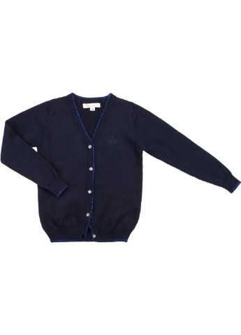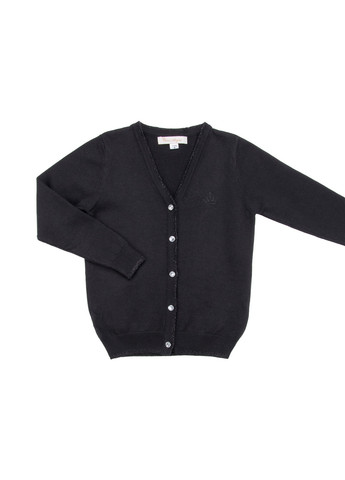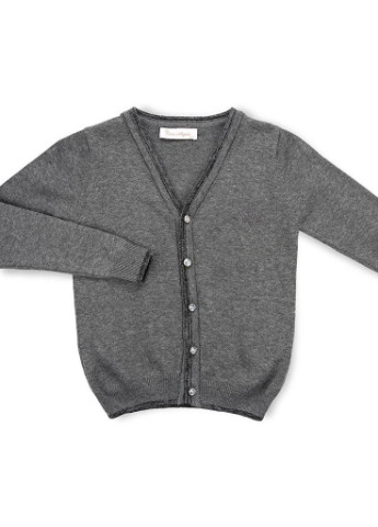 Однотонна, тонка, в'язана лицьовою гладдю, меланжева трикотажна кофточка сірого кольору з довгим рукавом – один з предметів бапокликого гардеробу, який можна носити практично з усіма речами. Зліва на грудях невелика вишивка. По V-подібній горловині та застібці-планці – подвійна, а по низу кофти та рукавів – одинарна, еластична тонка резинка з додаванням по краях смуг чорного, блискучого, тонкого люрексу. Красиві круглі оригінальні гудзики, що формою нагадують дорогоцінні сріблясті кристалики, у цій моделі не тільки функціональний, а й декоративний елемент, який розбавляє класичний образ, що створюється однотонною кофтою, і надає їй оригінальності та привабливості. М'який трикотаж в'язаний середньої розтяжності (добре тримає форму), приємний на дотик і сподобається кожній дівчинці.