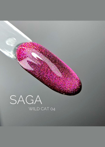 Гель-лак SAGA WILD CAT включають 5 різних кольорів, залежно від замагнічування Saga Professional Wild Cat - колекція гель-лаків, які сліпуче сяють і мають властивість реагувати на магніт (ефект "котяче око"). Переливаються трьома різними відтінками. Демонструють оптимальну щільність, тому ідеально перекривають ніготь одним вирівнюючим шаром. За бажання можна наносити двома шарами, а також на чорну підкладку. Рекомендація від виробника: для максимального прояву блиску і колірних переливів нанести гель-лак Saga Professional Wild Cat першим шаром, не замагнічувати, полімеризувати, а потім нанести другий тонкий шар і скористатись магнітом.