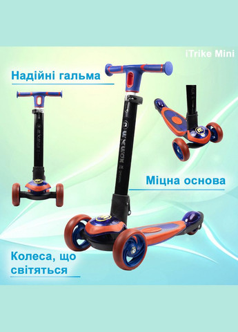 Дитячий триколісний складний самокат SPORT KIDS 2585 - це та річ, від якої Ваша дитина буде в захваті. Самокат — засіб пересування, що рухається шляхом відштовхування ногою від землі в положенні стоячи. Самокат використовується не тільки як персональний транспорт, але і для проведення дозвілля, заняття спортом та фізкультурою. Самокат SPORT KIDS 2585 зробить прогулянки з дітьми цікавішими, продуктивнішими та веселішими. Яскраві кольори, якісні матеріали завоюють серце Вашої дитини. Самокат зроблений із міцних матеріалів (пластик + алюміній), цей факт гарантує довготривале використання та надійність під час їзди. Самокат призначений для дітей від 4 років, максимальне навантаження на самокат – 35 кг. Характеристики: Рекомендований вік: від 3 до 6 років Конструкція: складана Поворот здійснюється нахилом керма Неслизькі ручки та підніжка Матеріал: полегшений алюміній та міцний карбонпласт Розмір платформи: 32 х 13 см Упаковка: кульок Діаметр переднього коліс: 12 см Діаметр заднього: 7,5 см Кількість коліс: 3 шт. Передні колеса: поліуретанові, прозорі, світяться Матеріал коліс: поліуретан