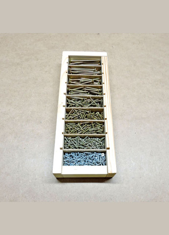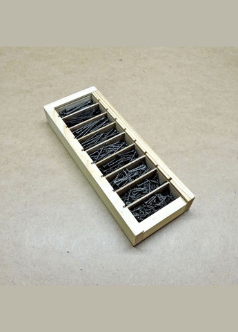 Дерев’яний пенал на 36 відділів з висувною кришкою. Внутрішні перегородки легко виймаються, дозволяючи ділити пенал на відділи потрібного розміру. Розміри зовнішні: висота - 4см, довжина - 30см, ширина - 40см. Розміри внутрішні: довжина - 27см, ширина - 7см, висота - 3см. Розміри відділів пенала: довжина - 7см, ширина - 27мм, висота - 3см. Товщина стінок 15мм. Матеріал: обв’язка - сосна; кришка, перегородки, дно - ДВП. Виріб відшліфовано і не вкрито лакофарбовими матеріалами.