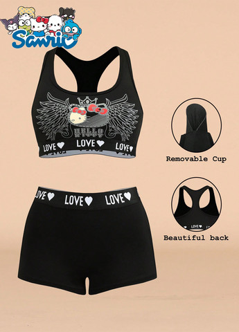 Комплект із двох предметів Sanrio Hello Kitty: бюстгальтер-майка та шорти. Цей комплект включає бюстгальтер-майка Hello Kitty та трусики-шорти. Бюстгальтер забезпечує середню підтримку завдяки спинці-борцюванню та конструкції без кісточок. Майка виготовлена із високоеластичного трикотажного матеріалу. Трусики-шорти мають середню посадку. Цей комплект ідеально підходить для повсякденного носіння, занять спортом або як багатошаровий гардероб. У комплект входять знімні вкладки. Прати вручну.