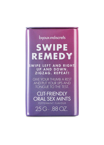 Грайте ще більш захопливу емоційну симфонію на ерогенних зонах вашого партнера, купіть м'ятні цукерки Bijoux Indiscrets Swipe Remedy – clitherapy oral sex mints. Маючи свіжий ментоловий смак, ці цукерки посилять відчуття від орального сексу, роблячи дотики язика до клітора або пеніса унікальними та контрастними. Використання м'ятних цукерок Bijoux Indiscrets Swipe Remedy – clitherapy oral sex mints під час кунілінгусу або мінету перетворить ваш рот на справжній інструмент для задоволень. Прохолода перцевої м'яти у поєднанні з теплом вульви або члена подарує багатогранне смакове та тілесне задоволення. Гра температур наповнить ерогенні зони потужним зарядом збудження та ментоловою свіжістю. Просто покладіть цукерку до рота, дайте їй розтанути і запропонуйте своєму партнеру незабутню феляцію або кунілінгус. Особливості Bijoux Indiscrets Swipe Remedy – clitherapy oral sex mints: насичений м'ятний смак; охолоджувальний та освіжний ефект; без цукру. Бренд Bijoux Indiscrets родом із прекрасної Барселони. Творці бренду надають величезного значення якості, майстерному поєднанню повністю натуральних інгредієнтів та привабливої презентації, яка змушує бажати більшого. Еротична косметика, чуттєві аксесуари та іграшки від бренду Bijoux Indiscrets створюються жінками для жінок. Фахівці бренду створюють не просто продукцію, яка стимулює та розпалює уяву, а створюють дизайнерський продукт високого класу в еротичній індустрії. Бренд Bijoux Indiscrets – це не тільки секс, це краса, стиль та спосіб життя, якого гідна кожна жінка. Усі продукти бренду Bijoux Indiscrets виробляються з гіпоалергенних компонентів і не тестуються на тваринах. Заповніть ваш оральний секс свіжими імпульсами, купіть м'ятні цукерки Bijoux Indiscrets Swipe Remedy – clitherapy oral sex mints. Склад: підсолоджувачі (сорбітол - E420, ксиліт - E967, сукралоза - E955), антизлежувач (стеарат магнію -E470b), ароматизатори (кристал ментолу, ароматизатор м'яти перцевої, охолодний агент). Основа: перцева м'ята. Аромат: м'ятний. Об'єм: 25 г.