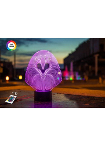 Відправка протягом 1-2 робочих днів.3D-нічник "Орел" (УВАЧНЕ ЗОБРАЖЕННЯ) подарункове пакування + 16 кольорів + пульт ДК + мережевий адаптер + батарейки (3ААА) 3DTOYSLAMP 3D стільники-нічники торгової марки 3DTOYSLAMP з ефектом тривимірного зображення стануть чудовим доповненням будь-якого інтер'єру. Просте управління. Колір світіння змінюється натисканням на кнопку на корпусі, а також за допомогою пульта ДК. Є режим автоматичного перемикання кольорів та можливість регулювати яскравість підсвічування нічника. Безпека. Світильник не нагрівається, не має запаху. Робота від батарей та мережі. 3D світильник "Орел" може працювати від мережі, комп'ютера або power-банку, а також від батарейок (мікропальчикові 3 шт.) ІДУТЬ У КОМПЛЕКТІ. Керування за допомогою пульта: Спрямуйте пульт у бік бази. Натисніть ON для увімкнення, OFF — для вимкнення лампи. Яскравість світіння регулюється за допомогою кнопок зі стрілочками вгору/вниз. Для вибору кольору світіння натисніть кнопку відповідного кольору. FLASH — зміна кольору за порядком. STROBE — зміна кольору у випадковому порядку. FADE — кольори змінюються з ефектом згасання. SMOOTH — плавна зміна кольору. Вам понравився кілька дизайнів 3D нічників і не знаєте, який вибрати? Чи можливо вашій дитині понравився інший мультяшний герой або Ви змінили інтер'єр у вашому поміщенні? Не обов'язково купувати новий нічник!; Унікальною особливістю 3D нічників є те, що зображення у ньому знімні. У нашому магазині представлений великий асортимент змінних пластин. Досить замовити у нас додаткове зображення — і у Вас новий 3D-нічник! Характеристики: Колір світла: 16 квітів світіння; Матеріал: акрил, пластик; Розмір: 25х19 см; Можливість: 5 Вт; Комплектація: подарункове пакування, корпус, акрилова пластина (ВОЛІЧНЕ ЗОБРАЖЕННЯ), пульт ДК, USB-кабель 1.5 м, мережевий адаптер,батарейки (3ААА), інструкція по-русски; Гарантія: 12 місяців; Ресурс лампи: до 50 000 годин роботи МАТЕРІАЛІ НЕ МІСТИТИ ШКІДЛИВИХ МОВ! НЕ НАГРІВАЄТЬСЯ! БЕЗПЕКА ДЛЯ ДІТЕЙ! Вся продукція торгової марки 3DTOYSLAMP пройшла тщательну перевірку на якість! Тип кріплення: На поверхню; Тип: Нічник; Стан: Новий; Комплектація: корпус, акрилова пластина, шнур USB -1.5 м, мережевий адаптер, інструкція російською мовою; Споживання, Вт/год: 0.5; Гарантія: 6 місяців; Тип джерела світла: світлодіодні (LED); Потужність, Вт.: 5; Додаткові характеристики: 7 кольорів світіння (теплий білий, зелений, синій, червоний, фіолетовий, блакитний, жовтий); Вимикач: сенсорний, на корпусі; Матеріал корпусу: пластик; Живлення: Від мережі, комп'ютера, Power Bank, прикурювача в автомобілі, 3хААА (3 мікропальчикові батареї); Країна виробник товару: Китай; Розмір: 250х190х87 мм;