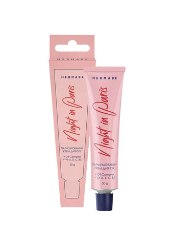 Крем для рук Mermade (Мермейд) Night in Paris призначений для щоденного догляду за шкірою рук. Його збагачена формула з комплексом олій та вітамінами забезпечує глибоке зволоження та живлення шкіри. Легка текстура крему швидко вбирається, не залишаючи відчуття липкості. Компактна упаковка робить його зручним для використання вдома та в подорожах. Верхні ноти: вишня, гіркий мигдаль, лікер; Ноти серця: вишня, слива, турецька троянда, жасмин, самбак; Базові ноти: боби тонка, перуанський бальзам, ваніль, бензоїн, кориця, сандал, кедр, гвоздика, ветівер, пачулі. Основні переваги: бореться зі шкірним дискомфортом, який може виникати через постійні контакти з водою та чистячими засобами, а також через зміни погодних умов спеціальні компоненти діють як антиоксиданти, захищаючи шкіру від передчасного старіння, сприяють виробленню колагену, підтримують здоровий вигляд шкіри та допомагають заспокоїти подразнення Спосіб застосування: нанести необхідну кількість крему на шкіру рук та рівномірно масажними рухами розподілити засіб по всій поверхні. Дати трохи часу на те, щоб крем поглинувся шкірою. Повторювати за необхідністю та бажанням відчути неймовірний улюблений аромат. Характеристики Виробник: Mermade, Україна.