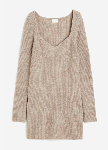 Коротке приталене плаття з м’якого трикотажу в рубчик з вирізом у вигляді сердечка, фігурним трикотажем на висоті грудей і довгими рукавами.
