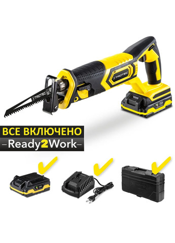 Акумуляторна шабельна пила Trotec PRCS 10-20V сертифікована в Україні і має сертифікат відповідності чинним стандартам якості та безпеки. На додаток літій-іонний зарядний пристрій з акумулятором також пройшли випробування на безпеку, так що ви можете бути в повній безпеці з якістю Trotec. Компанія Trotec для всіх своїх акумуляторних інструментів використовує Li-Ion батареї типу NMC (із нікеле-марганцево-кобальтовим катодом), що забезпечує стало високу потужність інструменту, не залежно від поточної ємності акумуляторної батареї, та запобігає саморозряду батареї протягом років. Тобто якщо ви не користуєтесь інструментом протягом тривалого часу - будьте впевнені, що коли він вам знадобиться - батарея лишиться зарядженою. Водопровідна труба, що стирчить зі стіни, сезонна обрізка дерев, обрізання дощок чи розпилювання фанери за розміром – це лише кілька застосувань, де шабельна пила Trotec PRCS 10-20V стане незамінним інструментом. На будівництві чи в господарстві, там де немає доступу до електромережі, чи недостатньо місця для застосування інших інструментів, - застосування шабельної акумуляторної пили стане ідеальним рішенням. Опорна підошва (напрямний башмак) шабельної пилки адаптується до поверхні заготовки з нахилом до 30°. Для оптимального використання довжини пилкового полотна та точного встановлення відповідної глибини різання опорну основу можна відрегулювати на необхідну довжину без додаткового інструментів. Якщо є необхідність працювати з пиляльним полотном, висота якого вища за виїмку в опорній підошві, ви можете просто зняти опорну підошву і працювати без неї. Щоб забезпечити точне і ефективне розпилювання будь-якого матеріалу, Trotec PRCS 10-20V має плавний пуск та безступінчате регулювання швидкості ходу, тобто швидкість руху пиляльного полотна можна плавно регулювати в діапазоні від 0 до 3000 об/хв за допомогою кнопки пуску. Легкий натиск - низька швидкість, повний натиск - максимальна швидкість. Просто та інтуїтивно зрозуміло! При необхідності оптимізувати роботу пиляння можна за допомогою маятникового ходу. Достатньо встановити перемикач у положення (1) і швидкість розпилювання особливо м'яких матеріалів типу деревини значно пришвидшиться. Однак при обробці твердих матеріалів або дуже тонких заготовок, особливо коли кромки після розрізу повинні бути тонкими та чистими, бажано вимкнути маятниковий хід - положення перемикача (0). Пиляльні полотна можна миттєво замінити без додаткових інструментів завдяки зручному швидкозатискному патрону. А щоб ви могли відразу приступити до робіт, високоякісне пиляльне полотно по дереву вже включено в комплект. Ви також можете підтримувати пилку абсолютно чистою і охайною після використання та зручно її зберігати і транспортувати, оскільки відповідний пластиковий кейс вже включений у стандартну комплектацію. Потужна акумуляторна батарея MultiFlex 20 В слайдерного типу не має ані ефекту пам’яті, ані саморозряду завдяки літій-іонній технології, і її можна повністю зарядити менш ніж за годину за допомогою зарядного пристрою з функцією швидкого заряду, що входить у комплект. А головне, що завдяки концепції Trotec FlexPower батарею можна використовувати для багатьох інших електроінструментів Trotec. Технічні характеристики: Тип: пила шабельна; Джерело живлення: акумулятор; Споживана потужність: 40 Вт; Номіналь