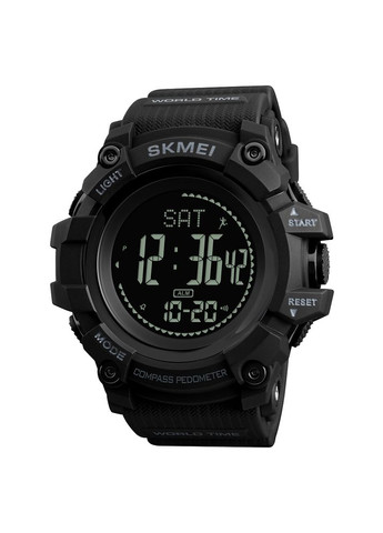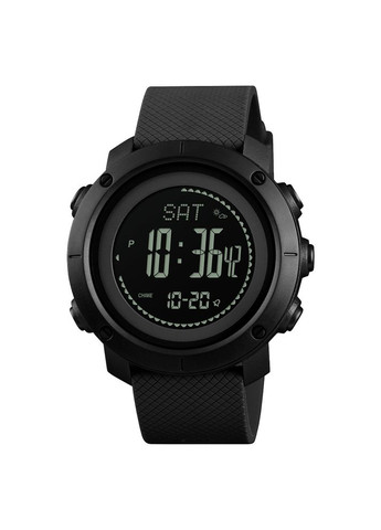 Тип механізму: Електронний; Тип ремінця: Ремінець; Бренд: Skmei; Стать: Чоловічі; Підсвічування: Електролюмінесцентне; Функції: Альтиметр, Термометр, Погода, Компас, Лічильник калорій, Секундомір, Шагомер, Календар, Будильник, Таймер; Стиль: Спортивний, Армійський; Скло: полікарбонатне; Ширина: 22; Товщина: 19 мм; Форма корпусу: Кругла; Країна виробника: Китай; Матеріал ремінця: Каучук; Матеріал: Полімер; Водонепроникність: 30 м; Особливості: Діаметр корпусу: 55 мм, Тип механізму: Електронний, Гарантія: 12 місяців, Стать: Чоловічі; Вага, м: 76; Розміри, мм: 54 х 53; Колір: Чорний; Індикація: Годинник, Хвилини, Секунди, День тижня, Число; Тип циферблату: Електронний; Гарантія: 12 місяців; Вид циферблату: Арабська цифра; Браслет / Ремінець: Ремінець; Колір ремінця: Чорний; Довжина ремінця, см: 26;