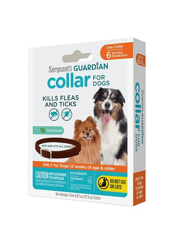 Як захистити собаку від бліх та кліщів ефективно та надовго? Нашийник Sergeant's Guardian - один із зручних і надійних способів позбавити вашого вихованця від настирливих паразитів на цілих 6 місяців! Є вікове обмеження – не вдягати цуценят віком до 12 тижнів. Нашийник виготовлений в універсальному розмірі для всіх порід собак. Його довжина – 60 см, яку можна відрегулювати, просто обрізавши зайве. Для цуценят, що ростуть, запас довжини краще залишати великим, щоб нашийник «ріс» разом з вихованцем. Активна діюча речовина протипаразитарного нашийника для собак Sergeant's Гардіан – дельтаметрин. Це інсектицид піретроїдів ІІ покоління контактної дії. Він діє як нейротоксин на нервову систему ектопаразитів, блокує нервові імпульси в організмі комах, викликаючи у них параліч та загибель. Дія нашийника заснована на системі уповільненого виділення діючих речовин, які рівномірно розподіляються за ліпідним шаром. Максимальний захист досягається через 2-3 тижні, тому варто потурбуватися про додатковий захист вихованця від бліх та кліщів на цей період. Чому варто купити нашийник від бліх та кліщів для собак Sergeant's Guardian: вбиває дорослих бліх та кліщів, у тому числі тих, що передають хворобу Лайма; працює при контакті, до укусу комахи; тривалий захист на 6 місяців; ефективність протягом усього заявленого терміну дії завдяки системі уповільненого виділення діючих речовин, що рівномірно розподіляються по шкірі собаки; водонепроникний; не має неприємного запаху, навпаки, має свіжий аромат; комфортний для тварини; простий у використанні; легко регулюється; універсальний для всіх порід собак старше 12 тижнів; індивідуальна герметична упаковка. Вага нашийника: 27,5 г. Габаритні розміри упаковки: 10х12, 7х2, 5 см. ВАЖЛИВО! Підвищена чутливість може бути викликана БУДЬ-Яким продуктом, що містить пестициди! При виникненні ознак підвищеної чутливості (почервоніння, свербіж, висипання або інші ознаки дискомфорту), викупайте вихованця з м'яким шампунем і великою кількістю води. Якщо симптоми не минають, негайно зверніться до ветеринару.