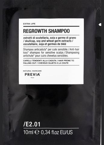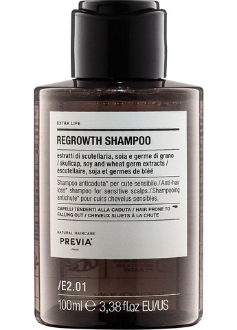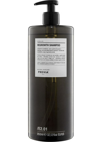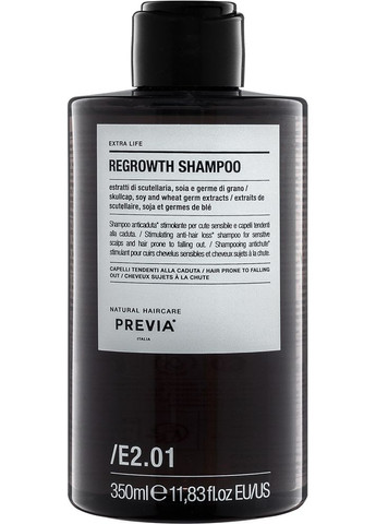 Previa E2.01 Regrowth Shampoo – стимулювальний шампунь, розроблений для догляду за волоссям, що схильне до випадіння. Забезпечує м'яке очищення, активізує ріст волосся та зміцнює його. Основні переваги: Стимулює ріст волосся. Зміцнює корені та структуру волосся. Захищає від випадіння та окислювального стресу. Потовщує волосся, надаючи йому об’єму. Підходить для чутливої шкіри голови. Активні компоненти: Екстракт шоломниці – Захищає від окислювальних пошкоджень, активізує стовбурові клітини. Екстракт сої – Стимулює клітинну активність та метаболізм. Екстракт зародків пшениці – Активізує стовбурові клітини фолікулів та захищає від старіння. Аромат: Трав'янисто-свіжий, з легкими цитрусовими нотками. Для кого цей продукт: Для чутливої шкіри голови та волосся, схильного до випадіння. Результат: Міцне, здорове волосся з активним ростом і захистом від випадіння.
