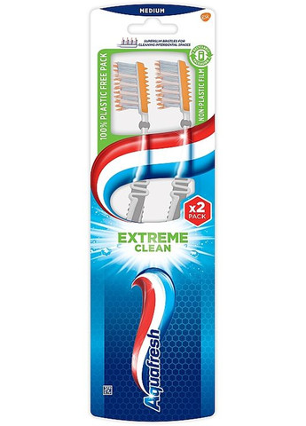 При правильному підході до вибору засобів та аксесуарів догляд за ротовою порожниною стає набагато ефективнішим. Фахівці бренду Aqfresh випустили набір із 2 зубних щіток Extreme Clean. Продукція цього бренду радує чудовою якістю, функціональністю та яскравим дизайном, тому користуватися щіткою удвічі приємніше!Особливості набору зубних щіток Extreme Clean бренду Aqfresh:- у наборі 2 аксесуари; - середня жорсткість; - сірий колір; - щетинки різного розміру проникають навіть у важкодоступні місця; - ретельно та ефективно очищає зуби та ясна; - на 25 % проникають глибше між зубами, знищуючи більше бактерій; - завдяки гумовій основі з ребристою поверхнею відбувається чищення язика, щік та ясен; - рухлива головка знижує тиск щітки; - не пошкоджує емаль та м'які тканини. Матеріал: нейлон