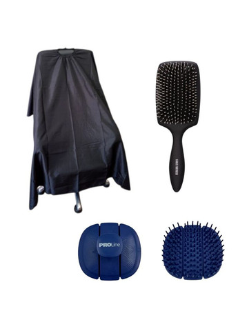 Щітка масажна "Лопата" комбінована BRM502-E, чорна Пеньюар Чорний CP18639, щільний, на гачках Щітка для миття голови шампунування Proline, синя Переваги Делікатне Розчісування: Комбінована щетина щітки-лопати BRM502-E ідеальна для розгладження та надання блиску. Надійний Захист: Щільний чорний пеньюар на гачках забезпечує високий рівень захисту одягу. Глибоке Очищення та Масаж: Щітка для шампунювання стимулює шкіру голови. Універсальність: Підходить для всіх типів волосся, особливо для розплутування довгого. Цей професійний набір Proline — це функціональний комплект інструментів, спеціально підібраний для делікатного розплутування, комфорту клієнта та глибокого очищення волосся. Щітка масажна "Лопата" комбінована BRM502-E (чорна): Велика масажна щітка-лопата з комбінованою щетиною (зазвичай, натуральна + нейлон). Така щетина ідеально підходить для делікатного розплутування, розгладження та надання блиску волоссю. Щітка ефективно масажує шкіру голови та допомагає розподілити природні олії по всій довжині. Пеньюар Чорний CP18639 щільний на гачках: Класичний чорний пеньюар, виготовлений зі щільного матеріалу. Така тканина забезпечує підвищену зносостійкість та кращий захист одягу клієнта під час стрижки або фарбування. Надійна фіксація на гачках забезпечує щільне прилягання по шиї. Щітка для миття голови шампунування Proline синя: Ця щітка-масажер використовується під час миття волосся для глибокого очищення шкіри голови від забруднень та залишків стайлінгу. Вона покращує кровообіг та забезпечує приємний масаж, що сприяє здоров'ю волосся.