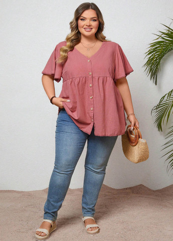Жіноча туніка SHEIN CURVE+. Ця туніка з V-подібним вирізом та рукавами-воланами, розкльошеним нижнім краєм та баскою. Вона ідеально підходить для повсякденного носіння навесні, влітку та восени. Туніка стандартної довжини та вільного крою. Застібка на гудзики спереду та оборка внизу.