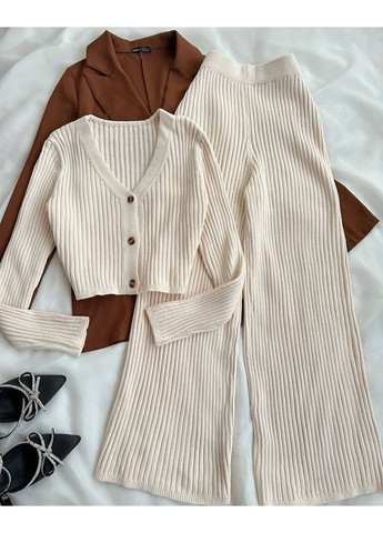 Демісезонний брючний костюм вільного крою, виконаний із трикотажної ангори. Верх прямого вільного крою з довгими рукавами та коміром-хомутом. Штани широкого прямого крою з поясною гумкою та кишенями. Напівобхват: Кофта: Груди: S (58), M (60), L (62), XL (64), XXL (66), 3XL (68), Довжина виробу - 64, Рукав - 57, Штани: Талія: S (28-35), M (30-37), L (32-39), XL (34-41), XXL (36-43), 3XL (38-45), Стегна: S (48), M (50), L (52), XL (54), XXL (56), 3XL (58), Довжина виробу - 107, Довжина по внутрішньому шву - 79, Тканина: Середньої еластичності.