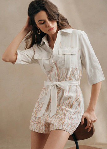 Жіночий білий тканий комбінезон Anewsta. Цей елегантний комбінезон з високою талією та вільним кроєм виконаний із поліестерової тканини. Відкладний комір та короткі рукави. Модель доповнена поясом та кишенями. Підходить для повсякденного носіння. Рекомендується прати у пральній машині.