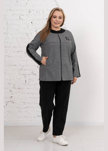Матеріал: напіввовна Склад: 70% вовна, 30% поліестер. Опис: Костюм для повсякденного носіння. Прямий жакет на змійці з елементами спортивного стилю. На рукавах та по горловині контрастна вставка. У рельєфах переду пертикальні вшивні кишені. Тканина жакету з класичним малюнком "гусяча лапка". Рукав трохи завужений. Штани однотонні вільного крою з косими кишенями, трохи завужені донизу. По талії широка гумка. Догляд: прання при температурі 30°C. Гладити слабо нагрітою праскою з вивороту. Жакет Розмір ОГ ОТ ОС Довжина рукава Ширина рукава Довжина 56 116 120 128 60 38 75 58 120 122 130 60 38 75 60 124 126 134 60 40 80 Брюки Розмір ОТ ОС Довжина шагового шву Довжина виробу 56 80-100 120 66 98 58 86-114 126 66 98 60 90-122 130 66 98