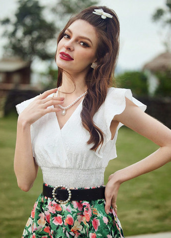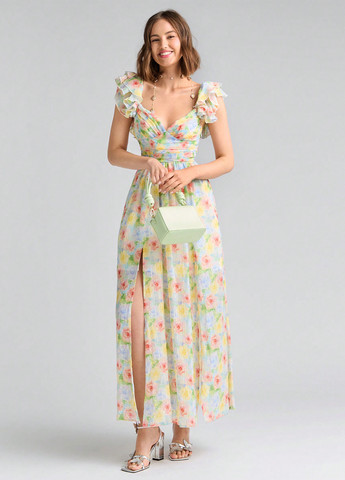 Дизайн : Сукня жовтого кольору середньої довжини з ніжним квітковим принтом, пишна спідниця з рюшами.