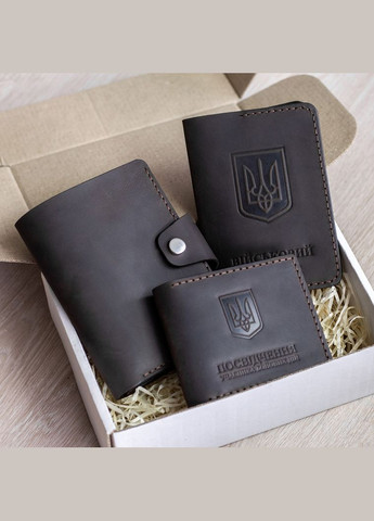 Набір із трьох шкіряних аксесуарів, який створений для військового, щоб захистити важливі документи та розмістити у портмоне все необхідне (картки, готівка, дрібниця, паспорт та інші документи). До складу набору входять: - Шкіряне портмоне Freedom, яке допоможе зібрати в одному місці картки, готівку, дрібницю, паспорт та інші документи; - Шкіряна обкладинка для посвідчення учасника бойових дій (УБД); - Шкіряна обкладинка на військовий квиток. Всі вироби упаковані в одну коробку як готовий подарунок.