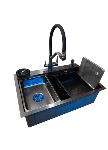 Комплект кухонної мийки Kraft HM 6845 NANO BLACK- це стильне та функціональне рішення для вашої кухні, яке ідеально поєднується за кольорами та матеріалами. Придбання готового комплекту - це набагато простіше, швидше та економніше, ніж купувати кожен елемент окремо. Ви отримуєте: Стильний дизайн та ідеальну сумісність між мийкою та змішувачем Суттєву економію коштів та часу До складу набору входять: кухонна мийка з нержавіючої сталі змішувач 2 лотки для розморожування Ополіскувач склянок,чашок дощечка вбудований диспенсер сифон, слив-перелив, кошиковий вентиль, сушарка Комплект кухонної мийки Kraft HM 6845 NANO BLACK чорного кольору, виконану вручну — яскравий хіт цього сезону! Її функціональні можливості і комплект з змішувачем роблять цю модель незамінною частиною будь-якої сучасної кухні. Змішувач із висувним душем дозволяє легко мити фрукти, овочі та зелень, щоб робота на кухні стала ще комфортнішою. Виготовлена з високоякісної нержавіючої сталі SUS 201 із міцним PVD-покриттям, ця мийка славиться своєю стійкістю до корозії і тривалим терміном служби. Товщина борту становить 3 мм. Раковина має округлі внутрішні кути та легкий ухил дна, що запобігає застою води і значно полегшує догляд. Вона оснащена покращеним зливником справа для зручності користування. Багатофункціональна мийка Kraft HM 6845 NANO BLACK дозволяє максимально заощадити простір кухонного приміщення, включаючи обробну дошку з вологостійкої деревної породи, лоток для розморожування та мийний лоток для овочів і фруктів. Ергономічний дизайн і сучасна естетика вже роблять цей комплект справжнім акцентом вашої кухні. Розмір – 750х460х230 мм, з додатковими монтажними отворами. Стильний чорний колір і гнучкий довгий вилив змішувача, який можна переміщати вправо або вліво, забезпечують зручність і економію ресурсів. Глибока і просторна, вона ідеальна для миття великих каструль і столових приборів без бризок. Характеристики Матеріал Нержавіюча сталь Поверхня Брашована Серія Gebürstet Вид монтажу Інтегрований Глубина изделия, мм 490 Ширина виробу, мм 450 Габарити виробу, мм 270х830х550 Ширина шафи для монтажу, мм Вид слива-перелива Так Гарантія 36 місяців Країна виробник Польща Комплектация Німеччина Комплектація Мийка, сифон, злив-перелив, кошиковий вентиль, кошик. вага брутто, кг 9,4 Вага нетто, кг 6,4 Модель Geburstet-7848LHM Довжина виробу, мм 680 Глубина, мм 450 Габарити пакування, мм 800х520х270 Тип виробу Кухонна мийка Розмір основної чаші (ШхГхВ), мм 350х640х230 Товщина сталі, мм 3/1 Сифон Так Наявність чаші/ робочої поверхні (сушки) Так Висота виробу, мм 230 Глибина виробу, мм 450 Ширина виробу, мм 680 Колір графіт Кількість чаш 1 основна Форма мийки Прямокутна Наявність крила Так Кількість на складі 10 Наявність сифона Так Форма Прямокутна Змішувач для кухні з підключенням до фільтра Kroner KRP Edelstahl Klassisch - PVD03817BLK - це високофункціональний та стильний санітарний пристрій, призначений для забезпечення комфорту та зручності у вашій кухні. Цей змішувач має такі ключові характеристики: Модель призначена для одночасного підключення до водопроводу та фільтру, забезпечуючи можливість використання як звичайної, так і питної води. Це зручне рішення для підтримки здорового способу життя. Силіконовий вилив забезпечує зручність при митті раковини та габаритного посуду, роблячи процес більш ефективним та комфортним. Надійна робота забезпечуєт