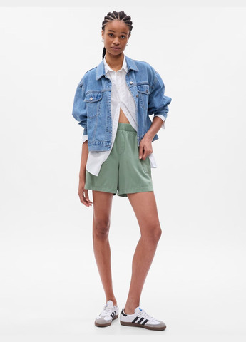 Шорти-карго із текстурованої тканини із сумішевої віскози. Вільний крій із закритою гумкою та вузькою куліскою на талії. Бічні кишені з клапаном та кнопкою, кишені на штанинах з клапаном та хибні задні кишені з клапаном. ***Розмір - L Напівобхват пояса - 86,00 см Довжина виробу – 40,00 см Напівобхват стегон - 65,00 см Можливе пошкодження бирки