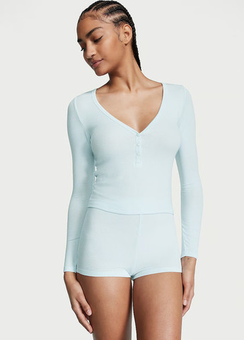 Домашня жіноча піжама Victoria Secret. Дуже затишний комплект домашньої піжами. кофта з круглим вирізом та короткі шортики з еластичним поясом. Кофта в рубчик з круглим вирізом прикрашена трьома ґудзиками. Довгі рукави.  Шортики в рубчик з високою талією та еластичним поясом. Приємна та м'яка до тіла тканина в рубчик. У цьому домашньому комплекті Ви почуватиметеся максимально комфортно. Відмінна якість.