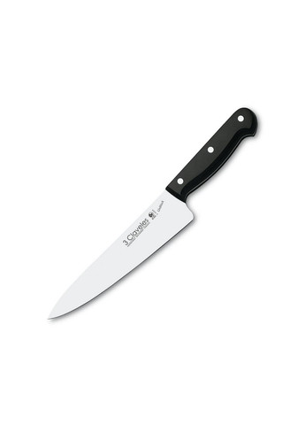 Відправка протягом 1-2 робочих днів. Кухарський ніж із широким, гладким, стійким та міцним лезом. Це універсальний інструмент для професіоналів, який чистить, нарізує та шаткує всі види м'яса, овочів та риби. Призначений для інтенсивного використання в найвибагливіших професійних сферах, де потрібна максимальна продуктивність та захист. Microban - це антибактеріальна технологія, сертифікована NSF International (Національний санітарний фонд). На професійних кухнях рукоятки ножів різняться за кольором залежно від продукту, що розрізається, щоб уникнути перехресного забруднення. Жовтий: сире біле м'ясо Синій: риба, морепродукти Червоний: сире червоне м'ясо Чорний: всі види їжі Зелений: овочі, зелень Характеристики: Серія: Proflex; Матеріал леза: нержавіюча сталь; Матеріал ручки: профлекс; Призначення: Шеф; Колір: чорний; Довжина леза: 200 мм; Тип леза: Тип леза: Штамповане; Країна реєстрації бренду: Іспанія; Виробник: 3 Claveles; Матеріал рукояті: Профлекс; Країна-виробник товару: Іспанія; Довжина леза: 200 мм; Матеріал леза: Нержавіюча сталь; Тип кріплення рукояті: Всадний; Колір рукояті: Чорний; Матеріал: Нержавіюча сталь, профлекс; Серія: Proflex; Тип: Європейський шеф-ніж; Торгівельна марка: 3 Claveles; Колір: Чорний;