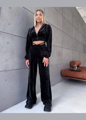 Штани мають широкий крій палаццо, що створює стильний та сучасний силует. Висока посадка підкреслює талію, а вільні штанини, що струмують, візуально подовжують ноги і додають образу нотку розкоші. Еластичний пояс з можливістю регулювання забезпечує зручну посадку та комфорт протягом усього дня.