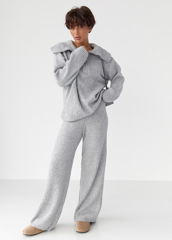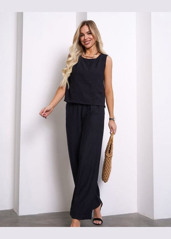 Стильний літній комплект з льняної тканини. Класичні брюки-палаццо прямого крою, з складками по переду, виготовлені з якісної льняної тканини. Модель з комфортною високою посадкою стане базовим елементом для створення повсякденного чи ділового образу. Модель доповнене зручними бічними кишенями. По спинці на талії – резинка, ширина шльовок– 6 см.