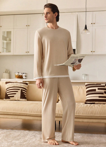 Чоловічий піжамний комплект із довгим рукавом. Цей комплект складається з лонгсліву з довгим рукавом та штанів. Жіночий лонгслів з круглим вирізом і рукавами стандартної довжини. Штани подовжені та вільного крою. Комплект виготовлений із сумішевої тканини середньої еластичності (95% поліестер, 5% еластан). Підходить для повсякденного носіння та допускає машинне прання або хімчистку.