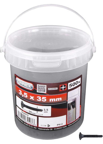 Шурупи для гіпсокартону Connex 3,5 x 35 мм, 500 шт, дрібна різьба, PH-привід, чорні фосфатовані Шурупи для гіпсокартону Connex 3,5 x 35 мм ідеально підходять для роботи з гіпсокартоном у будівництві. Вони оснащені свердлильним наконечником для товстостінних профілів та металевих конструкцій, що робить їх відмінним вибором для дому та майстерні. Шурупи виготовлені з високоякісної легованої сталі та мають фосфатоване покриття, яке захищає від корозії та забезпечує легку обробку шпаклівкою. Головка у формі трубки забезпечує рівну поверхню та врівноважений фініш з матеріалом. Шурупи упаковані у практичне та багаторазове пластикове відро для зручного зберігання та організації. Характеристики товару: Привід: хрестовий PH Розмір: 3,5 x 35 мм Тип різьби: дрібна різьба Форма головки: трубчаста Покриття: чорне фосфатоване Комплектація: 500 штук в пластиковому відрі Ці шурупи Connex є ідеальним вибором для монтажу гіпсокартону, забезпечуючи надійність та довговічність.
