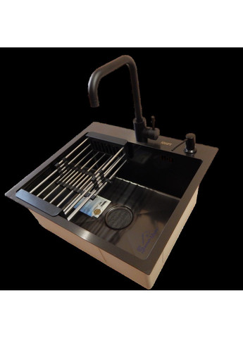 До комплекту входить: мийка сифон Кран корзинка дозатор для мила Кухонна мийка Kroner KRP Derby - 5843HM Brush - це стильне і функціональне рішення для вашої кухні. Маючи прямокутну форму з розмірами 580 мм в ширину і 430 мм в глибину, ця мийка стане відмінним доповненням до будь-якої кухні. Вона має висоту 215 мм і виготовлена із нержавіючої сталі, що робить її міцною і довговічною. Ця мийка має інтегрований спосіб монтажу і пропонує три варіанти установки: рівень із стільницею, над стільницею (подібно до врізних мийок) і під нею. Це надає вам можливість вибору оптимального розташування для вашої кухні. Чорний колір мийки та брашована поверхня додають їй елегантний вигляд і роблять її сучасною. Мийка обладнана переливом і сифоном для зручного користування. В комплект входять сама мийка, сифон, злив-перелив та кошиковий вентиль, що робить встановлення і використання цієї мийки легкими і зручними. Кухонна мийка Kroner KRP Derby - 5843HM Brush - це ідеальний вибір для вашої кухні, який поєднує в собі стильний дизайн і практичність, допомагаючи вам легко виконувати всі кулінарні завдання і виглядати елегантно при цьому.